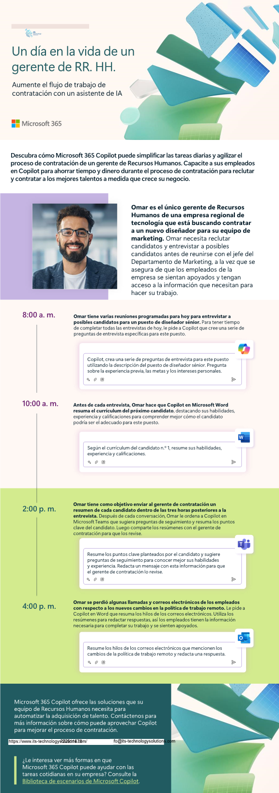 Cuando trabaja con nosotros para incorporar Microsoft 365 Copilot a las aplicaciones de productividad que usa a diario, tiene un asistente de #AI para realizar las tareas que más tiempo consumen. Explore cómo Copilot tiene el potencial de aumentar su flujo de trabajo de contratación en nuestra nueva infografía. #SociodeMicrosoft