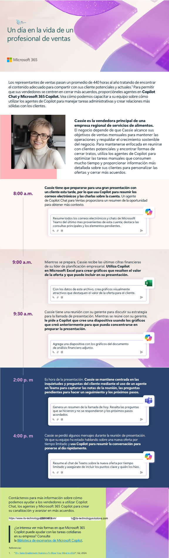 Asóciese con nosotros y enseñe a sus vendedores a usar agentes en #Copilot Chat y Microsoft 365 Copilot para automatizar tareas redundantes, adaptar las propuestas de los clientes y cerrar acuerdos más rápido. Obtenga más información en nuestra última infografía. #SociodeMicrosoft
